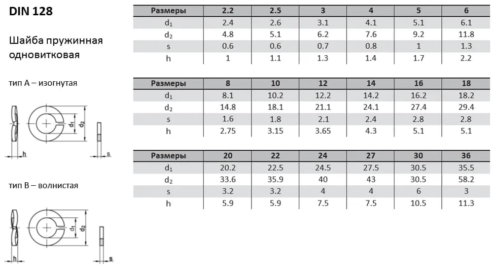 Пружинная шайба DIN 128 имеет волнообразную форму профиля, создающую осевое пружинящее усилие для компенсации зазоров и предотвращения ослабления затяжки, вариант исполнения 128 A. Технические параметры гармонизированы со стандартами: ISO 7434, ГОСТ 10462. При замене шайб между стандартами рекомендуется сверять допуски на внутренний диаметр отверстия и толщину, так как они могут незначительно отличаться, сохраняя полную совместимость по внешнему диаметру и классу точности.