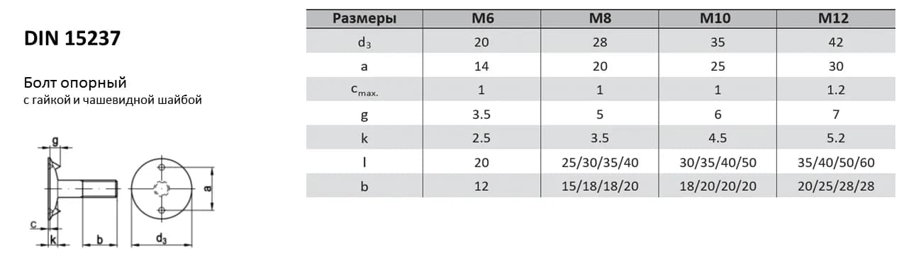 Болт 3.6 М12х35, DIN 15237 норийный (транспортерный) с гайкой и чашевидной шайбой