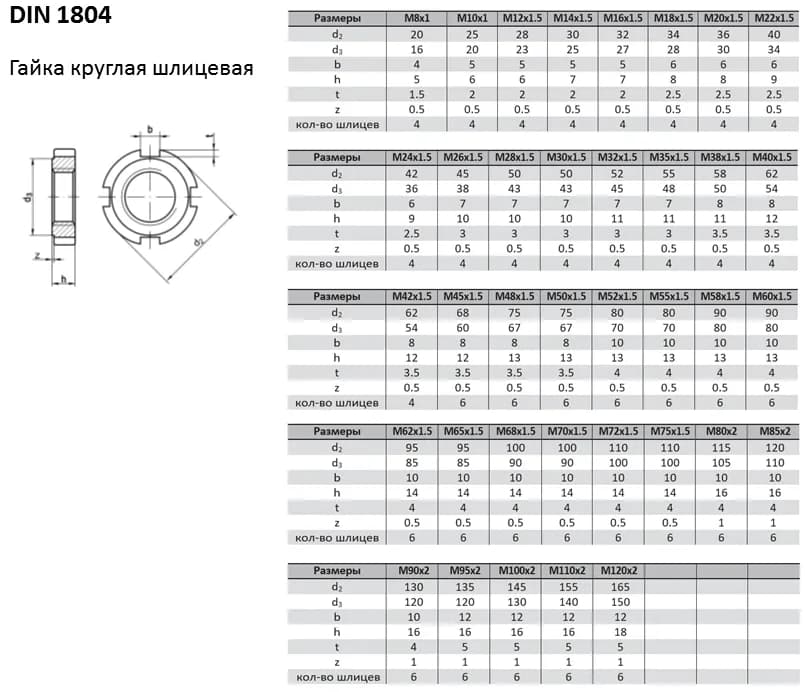 Шлицевая гайка DIN 1804 используется для фиксации подшипников и деталей на валах. Затягивается с помощью специального рожкового ключа. Аналоги стандарта: ГОСТ 11871-88. При замене гаек между стандартами рекомендуется сверять ключевые параметры (диаметр и шаг резьбы, размер под ключ, внутренний диаметр отверстия), поскольку они могут незначительно отличаться.