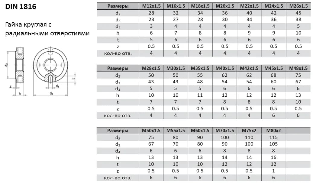 Круглая гайка с радиальными отверстиями DIN 1816 затягивается специальным штифтовым ключом и применяется для прецизионной настройки осевых зазоров. Аналоги стандарта: ГОСТ 6393-73. При замене гаек между стандартами рекомендуется сверять ключевые параметры (диаметр и шаг резьбы, размер под ключ, внутренний диаметр отверстия), поскольку они могут незначительно отличаться.