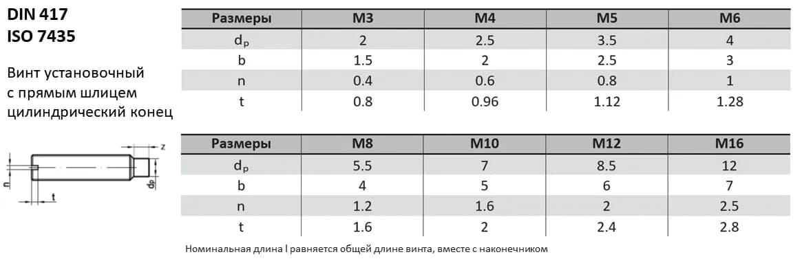 Установочный винт DIN 417 с прямым шлицем и длинным цилиндрическим концом предназначен для глубокой фиксации в деталях. Аналоги стандарта: ISO 7435, ГОСТ 1478-93. При замене винтов необходимо сверять ключевые параметры (диаметр и шаг резьбы, длину стержня, геометрию головки), поскольку они могут незначительно отличаться.