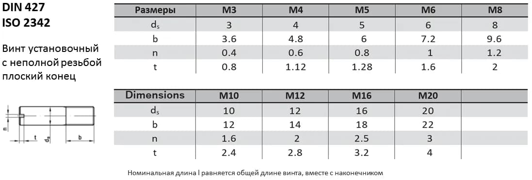 Неполная резьба позволяет более плотно стягивать соединяемые детали между собой. Плоский конец наконечника гарантирует фиксацию деталей без деформации их поверхности. Метиз относится к категории установочных винтов для жесткой фиксации деталей.