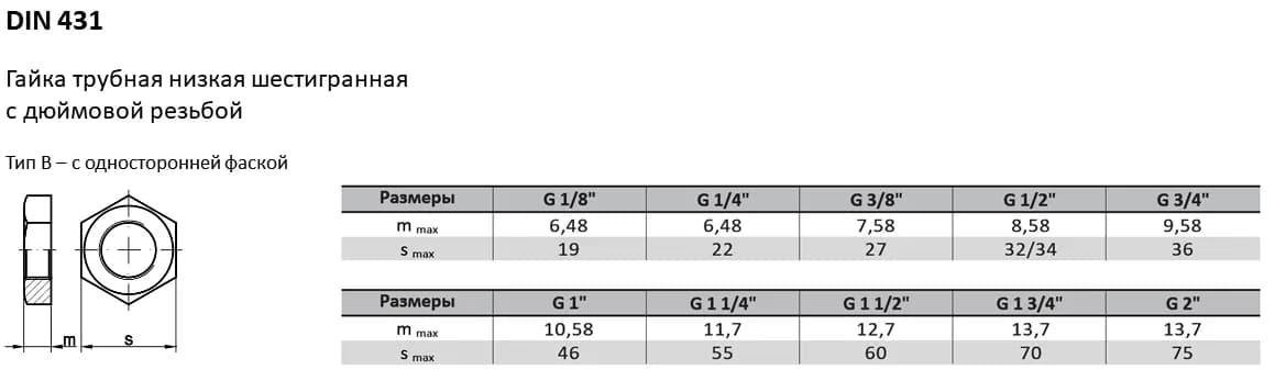 Трубная низкая шестигранная гайка DIN 431 используется для фиксации фитингов и соединительных элементов в трубопроводных системах. Аналоги стандарта: ГОСТ 8968-75. При замене гаек между стандартами рекомендуется сверять ключевые параметры (диаметр и шаг резьбы, размер под ключ, внутренний диаметр отверстия), поскольку они могут незначительно отличаться.