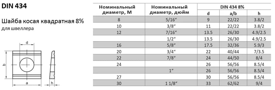 Квадратная косая шайба DIN 434 с уклоном 8% применяется для выравнивания угловых несоответствий при монтаже на наклонных полках швеллеров U-профилей. Технические параметры гармонизированы со стандартами: ISO 7092. При замене шайб между стандартами рекомендуется сверять допуски на внутренний диаметр отверстия и толщину, так как они могут незначительно отличаться, сохраняя полную совместимость по внешнему диаметру и классу точности.