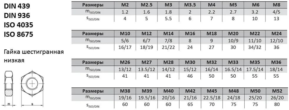 Низкая шестигранная гайка DIN 439 применяется в узлах, где пространство для монтажа ограничено, либо в качестве контргайки для предотвращения самоотвинчивания основного крепежа. Аналоги стандарта: ISO 4035, ISO 8675, ГОСТ 5916-70, ГОСТ ISO 4035-2014, ГОСТ ISO 8675-2014. При замене гаек между стандартами рекомендуется сверять ключевые параметры (диаметр и шаг резьбы, размер под ключ, внутренний диаметр отверстия), поскольку они могут незначительно отличаться.