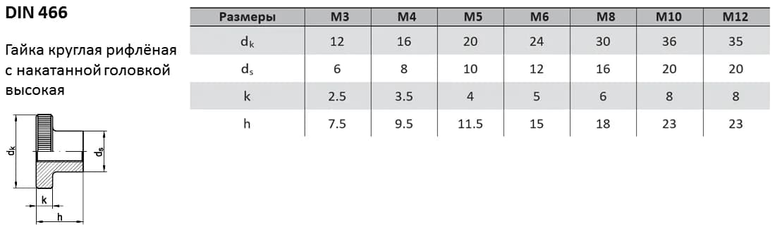 Накатанная высокая гайка DIN 466 с рифлением предназначена для ручной регулировки и быстрой фиксации в приборах и оборудовании. Аналоги стандарта: ГОСТ 14726-69. При замене гаек между стандартами рекомендуется сверять ключевые параметры (диаметр и шаг резьбы, размер под ключ, внутренний диаметр отверстия), поскольку они могут незначительно отличаться.