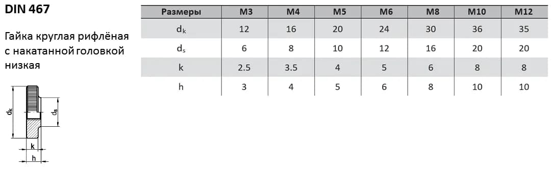 Накатанная низкая гайка DIN 467 используется в тех же целях, что и DIN 466, но в условиях дефицита места по высоте. Аналоги стандарта: ГОСТ 14726-69. При замене гаек между стандартами рекомендуется сверять ключевые параметры (диаметр и шаг резьбы, размер под ключ, внутренний диаметр отверстия), поскольку они могут незначительно отличаться.