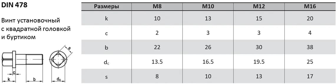 Винт DIN 478 с квадратной головкой и буртиком применяется в тяжелом станкостроении для передачи высоких крутящих моментов. Аналоги стандарта: ГОСТ 1488-84. При замене винтов необходимо сверять ключевые параметры (диаметр и шаг резьбы, длину стержня, геометрию головки), поскольку они могут незначительно отличаться.