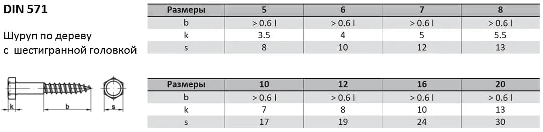 Сантехнический шуруп DIN 571 (глухарь) с шестигранной головкой разработан для высоконагруженных соединений в дереве. Мощная резьба обеспечивает надежную анкеровку. Аналоги стандарта: ГОСТ 11473-75. При замене между стандартами рекомендуется сверять ключевые параметры, так как возможны отличия в геометрии.