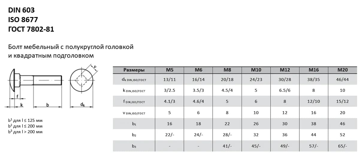 Мебельный болт DIN 603 отличается наличием гладкой полукруглой головки и квадратного подголовника для фиксации в материале. Технические параметры и допуски гармонизированы со стандартами: ISO 8677, ГОСТ 7802-81. При замене крепежа между стандартами рекомендуется сверять допуски на размер головки под ключ, так как они могут незначительно отличаться, сохраняя полную совместимость по резьбе и прочностным характеристикам.