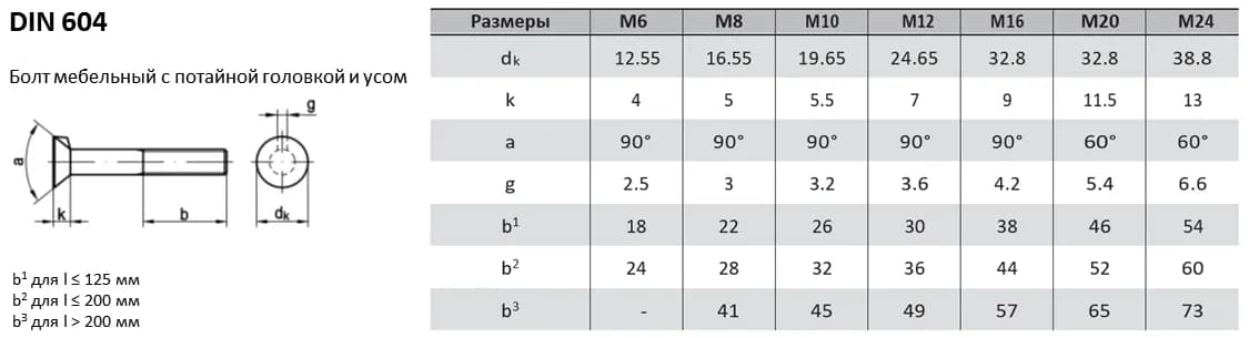 Болт DIN 604 имеет потайную головку с усом, предотвращающим проворачивание при монтаже.