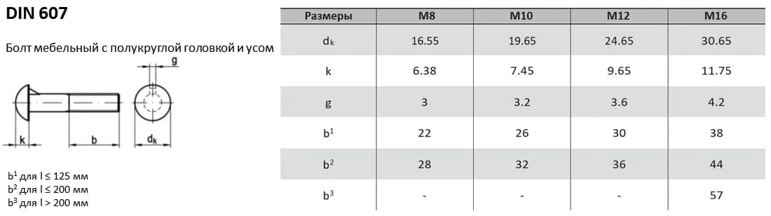 Болт DIN 607 с полукруглой головкой и усом используется для соединения деревянных и металлических элементов. Технические параметры и допуски гармонизированы со стандартами: ГОСТ 7801-81. При замене крепежа между стандартами рекомендуется сверять допуски на размер головки под ключ, так как они могут незначительно отличаться, сохраняя полную совместимость по резьбе и прочностным характеристикам.