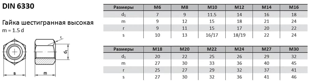 Высокая гайка DIN 6330 применяется в станочной оснастке и зажимных устройствах, где требуются частые переустановки под большой нагрузкой. Аналоги стандарта: ГОСТ 15523-70, ГОСТ 15524-70. При замене гаек между стандартами рекомендуется сверять ключевые параметры (диаметр и шаг резьбы, размер под ключ, внутренний диаметр отверстия), поскольку они могут незначительно отличаться.