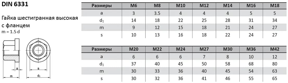 Высокая гайка DIN 6331 с фланцем обеспечивает максимальную площадь прижима и надежную передачу крутящего момента в тяжелонагруженных узлах. Аналоги стандарта: ГОСТ 8918-69. При замене гаек между стандартами рекомендуется сверять ключевые параметры (диаметр и шаг резьбы, размер под ключ, внутренний диаметр отверстия), поскольку они могут незначительно отличаться.