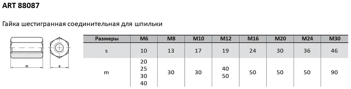 Классическая шестигранная форма обеспечивает удобство захвата стандартными ключами и головками. Удлиненная форма изделия предназначена для соединения двух резьбовых стержней.