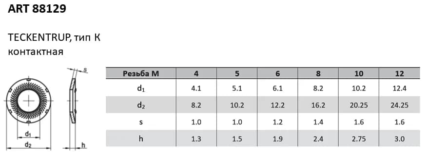 Стопорная конструкция призвана механически блокировать самопроизвольное отвинчивание крепежа. Наличие насечек на рабочих поверхностях многократно увеличивает коэффициент трения в соединении, механически блокируя самоотвинчивание при динамических нагрузках. Рифленая рабочая поверхность обеспечивает надежный электрический контакт между деталями, прорезая слои краски, лака или окислов для создания заземляющего соединения. Номинальный размер изделия соответствует метрическому крепежу с резьбой M10.