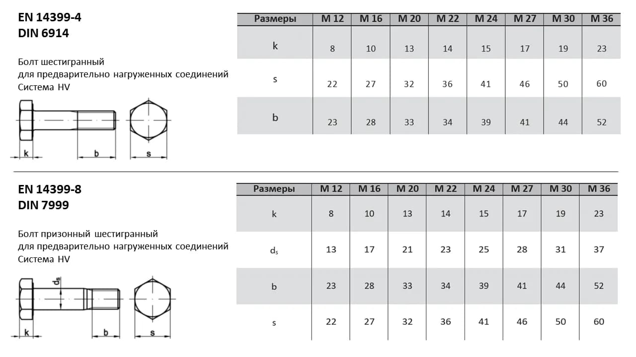 Высокопрочный болт DIN 6914 разработан специально для нагруженных стальных конструкций и мостостроения. Технические параметры и допуски гармонизированы со стандартами: ISO 7412, EN 14399-4:2005, ГОСТ 32484.4-2013, ГОСТ Р 52644-2006. При замене крепежа между стандартами рекомендуется сверять допуски на размер головки под ключ, так как они могут незначительно отличаться, сохраняя полную совместимость по резьбе и прочностным характеристикам.
