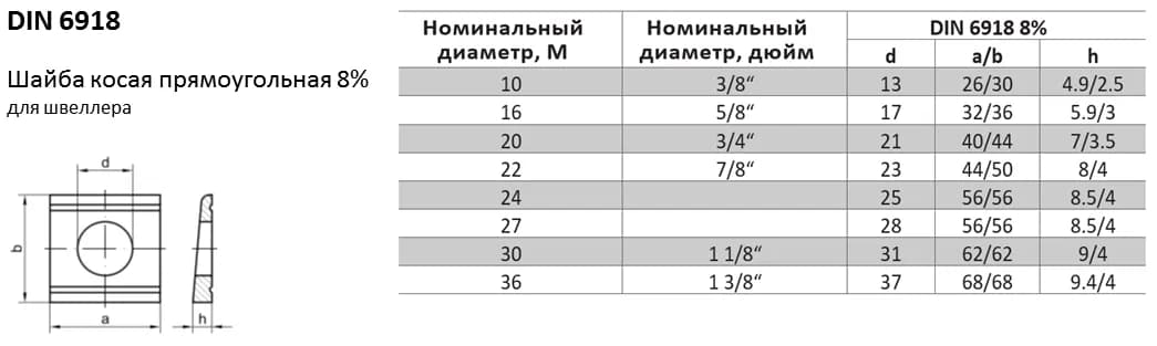 Косая квадратная шайба DIN 6918 для высокопрочных HV-соединений применяется при монтаже болтов на наклонных полках швеллеров.
