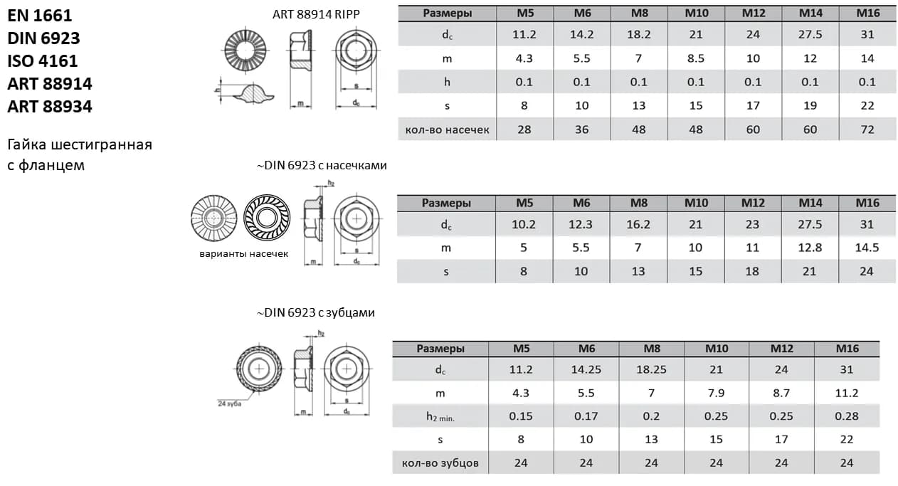 Гайка с фланцем DIN 6923 объединяет в себе функции гайки и шайбы. Фланец эффективно распределяет давление на поверхность детали и может иметь стопорные насечки. Аналоги стандарта: ISO 4161, ГОСТ Р ИСО 4161-2013, ГОСТ Р 50592-93, EN 1661. При замене гаек между стандартами рекомендуется сверять ключевые параметры (диаметр и шаг резьбы, размер под ключ, внутренний диаметр отверстия), поскольку они могут незначительно отличаться.