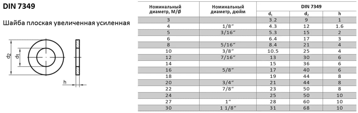 Усиленная шайба DIN 7349 с увеличенной толщиной используется при монтаже соединений с пружинными штифтами для восприятия ударных нагрузок.