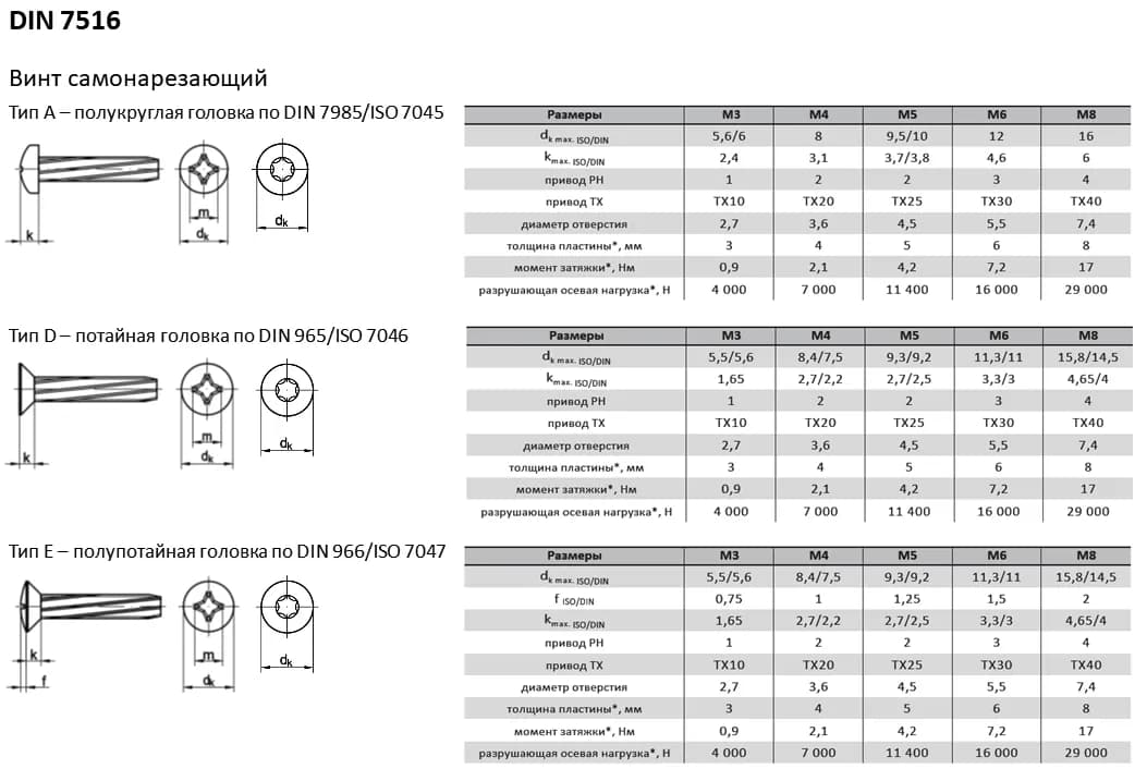 Самонарезающий винт DIN 7516 оснащен наконечником, который нарезает резьбу в процессе вкручивания. Аналоги стандарта: ГОСТ 10620-80. При замене винтов необходимо сверять ключевые параметры (диаметр и шаг резьбы, длину стержня, геометрию головки), поскольку они могут незначительно отличаться.