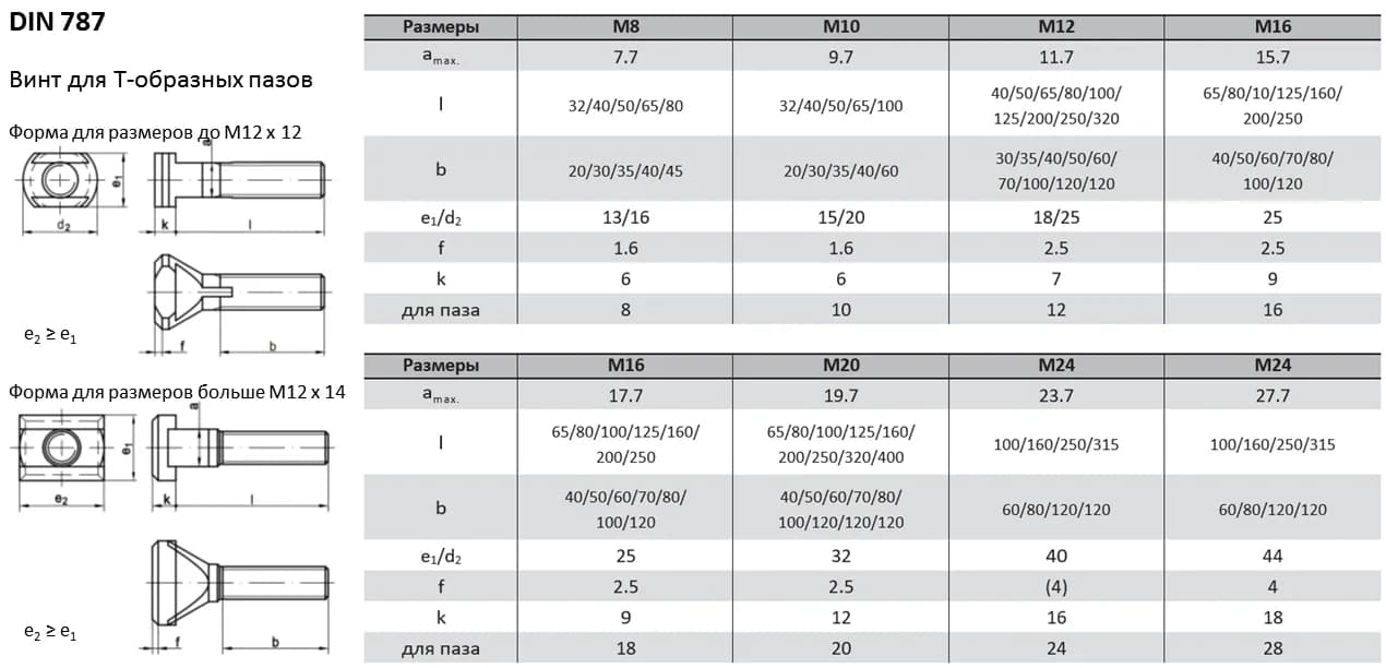 Винт DIN 787 предназначен для установки в Т-образные пазы станочных столов при фиксации зажимных устройств. Аналоги стандарта: ISO 299. При замене винтов необходимо сверять ключевые параметры (диаметр и шаг резьбы, длину стержня, геометрию головки), поскольку они могут незначительно отличаться.
