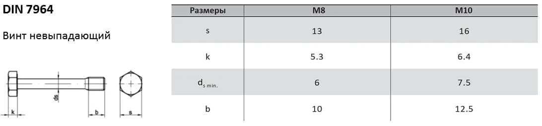 Невыпадающий винт DIN 7964 удерживается в панели после выкручивания, исключая потерю метиза. Аналоги стандарта: ГОСТ 10337-80, ГОСТ 10338-80. При замене винтов необходимо сверять ключевые параметры (диаметр и шаг резьбы, длину стержня, геометрию головки), поскольку они могут незначительно отличаться.