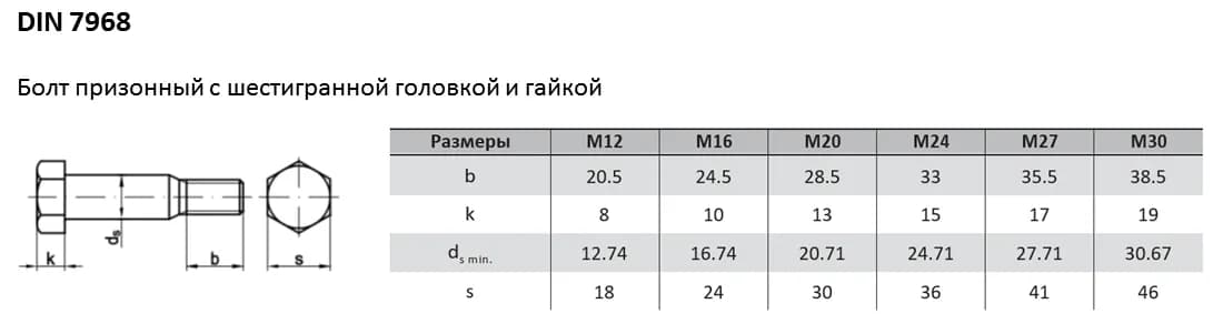 Призонный болт DIN 7968 с шестигранной головкой используется в стальных конструкциях (аналог DIN 609).
