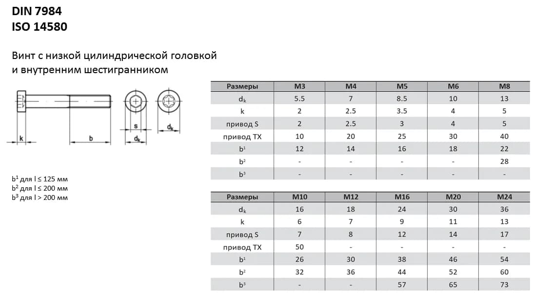 Винт DIN 7984 с низкой цилиндрической головкой подходит для компактных узлов с неглубокими цековками. Аналоги стандарта: ISO 14580, ГОСТ 11738-84, ГОСТ Р ИСО 14580-2012. При замене винтов необходимо сверять ключевые параметры (диаметр и шаг резьбы, длину стержня, геометрию головки), поскольку они могут незначительно отличаться.
