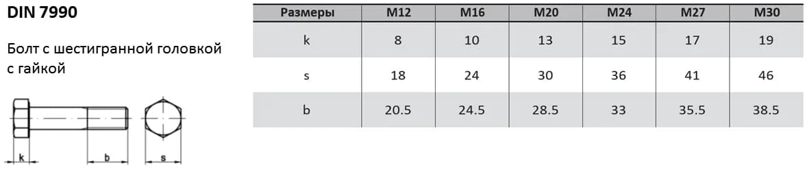 Болт стандарта DIN 7990 представляет собой крепежное изделие с шестигранной головкой и неполной укороченной резьбой, предназначенное для крепления стальных конструкций, поставляется в комплекте с гайкой. Технические параметры и допуски гармонизированы со стандартами: ГОСТ 15589, ГОСТ 7798, ГОСТ 7805-70. При замене крепежа между стандартами рекомендуется сверять допуски на размер головки под ключ, так как они могут незначительно отличаться, сохраняя полную совместимость по резьбе и прочностным характеристикам.