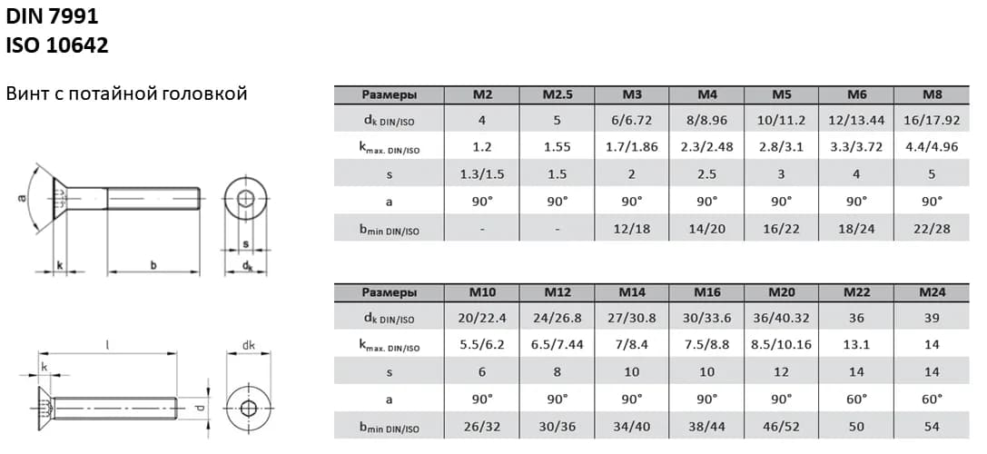 Винт DIN 7991 с потайной головкой под шестигранный ключ или TORX. Конструкция обеспечивает установку заподлицо, что важно для эстетики и безопасности узла. Аналоги стандарта: ISO 10642, ГОСТ Р ИСО 10642-2012. При замене винтов необходимо сверять ключевые параметры (диаметр и шаг резьбы, длину стержня, геометрию головки), поскольку они могут незначительно отличаться.