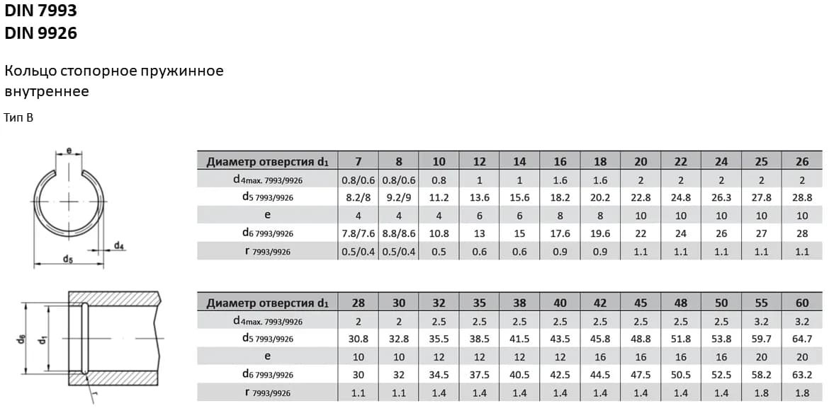 Круглое стопорное кольцо DIN 7993 изготавливается из пружинной проволоки круглого сечения и применяется в узлах, требующих передачи умеренных осевых нагрузок при сохранении компактности. Аналоги стандарта: ГОСТ 13941-86. При замене между различными стандартами рекомендуется сверять номинальные и предельные размеры посадочных мест (диаметры, ширину проточек/посадочных канавок) и толщину изделий, поскольку они могут незначительно отличаться даже при совпадении обозначений типоразмеров. Такие расхождения способны повлиять на корректность установки, герметичность, осевую фиксацию и надёжность работы узла, несмотря на формально одинаковый номинальный диаметр и класс точности.