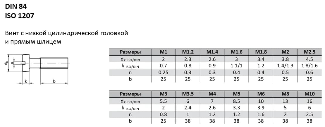 Винт DIN 84 с цилиндрической головкой и прямым шлицем — стандартный элемент электротехнических и бытовых приборов. Аналоги стандарта: ISO 1207, ГОСТ 1491-80, ГОСТ Р ИСО 1207-2013. При замене винтов необходимо сверять ключевые параметры (диаметр и шаг резьбы, длину стержня, геометрию головки), поскольку они могут незначительно отличаться.