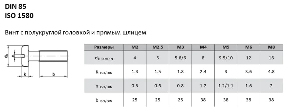 Винт DIN 85 имеет увеличенную полукруглую головку со шлицем, обеспечивающую широкое пятно контакта. Аналоги стандарта: ISO 1580, ГОСТ 17473-80, ГОСТ Р ИСО 1580-2013. При замене винтов необходимо сверять ключевые параметры (диаметр и шаг резьбы, длину стержня, геометрию головки), поскольку они могут незначительно отличаться.