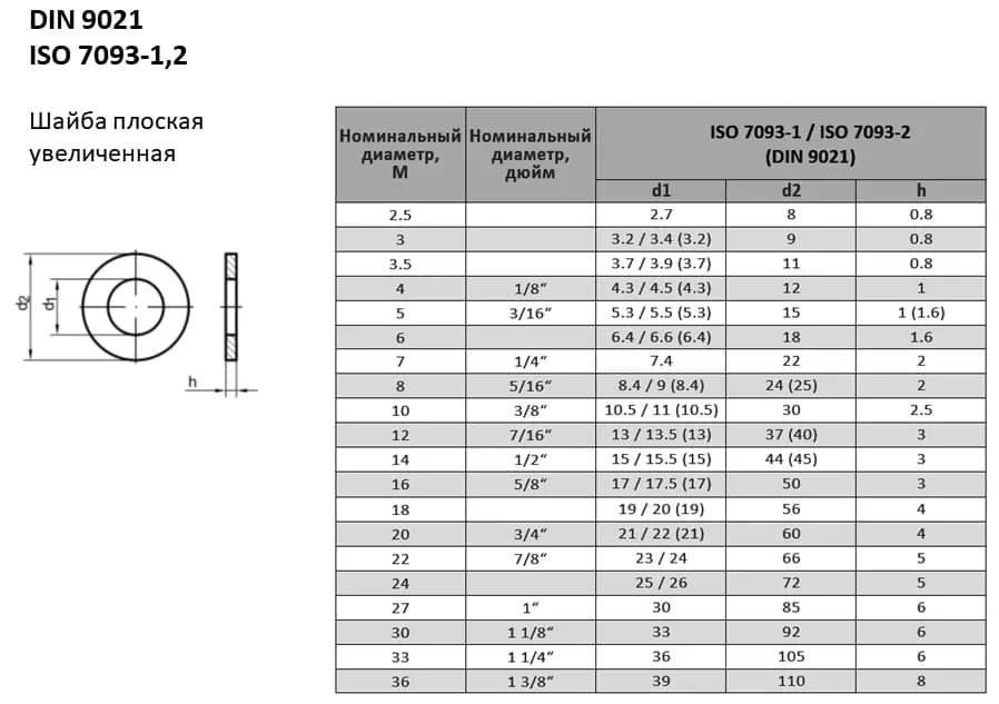 Кузовная шайба DIN 9021 имеет внешний диаметр, в три раза превышающий внутренний, что позволяет перекрывать увеличенные отверстия и снижать удельное давление на основание. Технические параметры гармонизированы со стандартами: ISO 7093, ГОСТ 6958. При замене шайб между стандартами рекомендуется сверять допуски на внутренний диаметр отверстия и толщину, так как они могут незначительно отличаться, сохраняя полную совместимость по внешнему диаметру и классу точности.