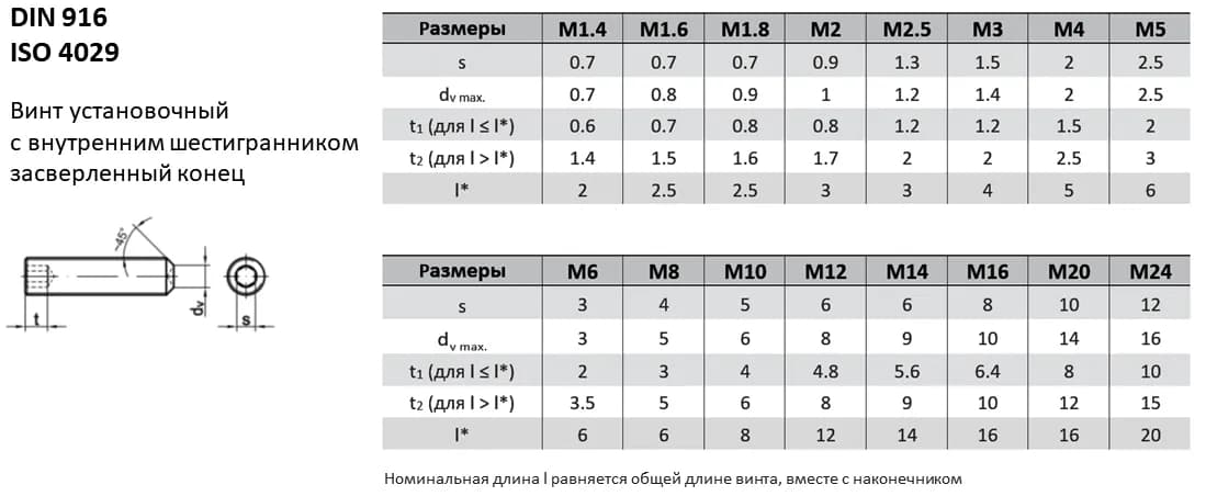 Установочный винт DIN 916 с засверленным наконечником. Обладает высочайшим сопротивлением осевому сдвигу при вибрациях. Аналоги стандарта: ISO 4029, ГОСТ 28964-91, ГОСТ Р ИСО 4029-2013. При замене винтов необходимо сверять ключевые параметры (диаметр и шаг резьбы, длину стержня, геометрию головки), поскольку они могут незначительно отличаться.