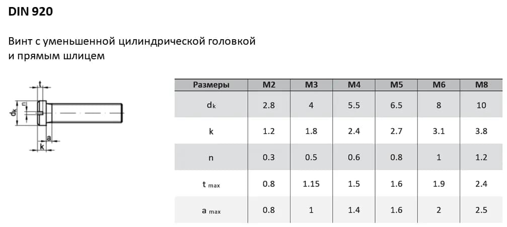 Винт DIN 920 с миниатюрной цилиндрической головкой используется в часовых и высокоточных приборах.