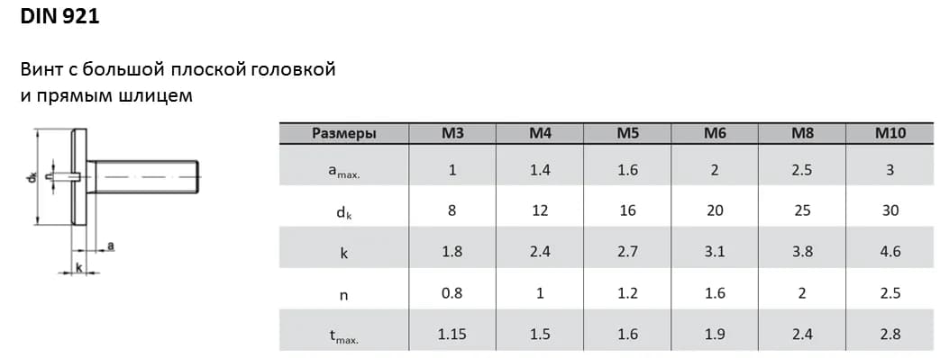 Винт DIN 921 отличается большой плоской головкой, которая гарантирует надежный прижим листовых элементов.