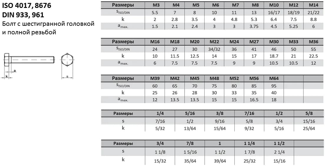 Болт стандарта DIN 933 является универсальным крепежным элементом с шестигранной головкой и полной резьбой по всей длине стержня. Аналоги стандарта: ISO 4017, ГОСТ 15589-70, ГОСТ 7798-70, ГОСТ 7805-70. При замене крепежа между стандартами рекомендуется сверять допуски на размер головки под ключ, так как они могут незначительно отличаться, сохраняя полную совместимость по резьбе и прочностным характеристикам.