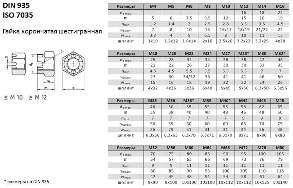 Корончатая гайка DIN 935 имеет специальные прорези под шплинт. Такая конструкция обеспечивает максимально надежную механическую фиксацию соединения в ответственных узлах машин и агрегатов. Аналоги стандарта: ISO 7035, ГОСТ 5918-73, ГОСТ 5932-73. При замене гаек между стандартами рекомендуется сверять ключевые параметры (диаметр и шаг резьбы, размер под ключ, внутренний диаметр отверстия), поскольку они могут незначительно отличаться.