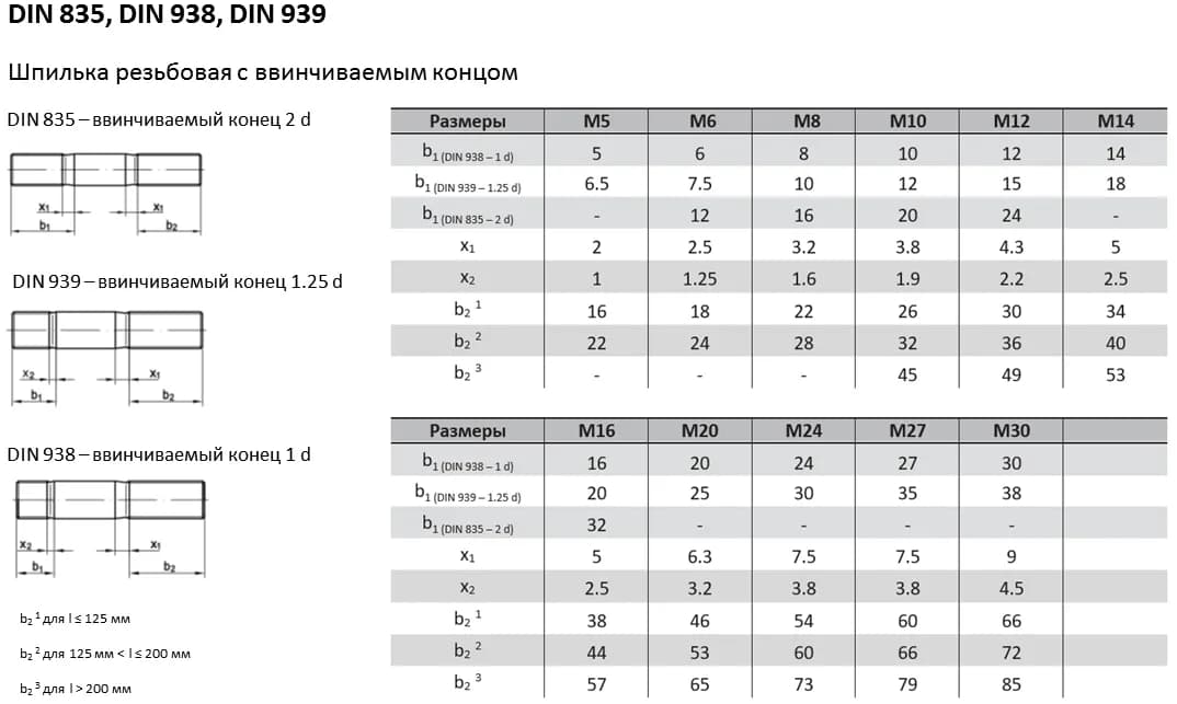 Шпилька DIN 939 имеет ввинчиваемый конец длиной 1.25. Увеличенная длина конца позволяет использовать её в деталях из материалов со средней прочностью, таких как серый чугун. Аналоги стандартов: ГОСТ 22034-76, ГОСТ 22035-76. При замене стандартов необходимо сверять ключевые параметры (диаметр и шаг резьбы, общую длину, тип концов), поскольку они могут незначительно отличаться.