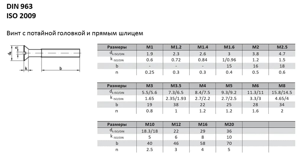 Винт DIN 963 с потайной головкой и прямым шлицем. Проверенное временем решение для узлов, требующих гладкой поверхности после сборки. Аналоги стандарта: ISO 2009, ГОСТ 17475-80, ГОСТ Р ИСО 2009-2013. При замене винтов необходимо сверять ключевые параметры (диаметр и шаг резьбы, длину стержня, геометрию головки), поскольку они могут незначительно отличаться.