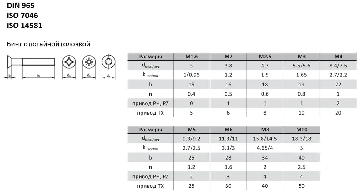 Винт DIN 965 — классический метиз с потайной головкой и крестообразным шлицем для монтажа «впотай». Аналоги стандарта: ISO 7046-1, ISO 7046-2, ISO 14581, ISO 7046, ГОСТ 17475-80, ГОСТ Р ИСО 7046-1-2013, ГОСТ Р ИСО 7046-2-2013, ГОСТ Р ИСО 14581-2021. При замене винтов необходимо сверять ключевые параметры (диаметр и шаг резьбы, длину стержня, геометрию головки), поскольку они могут незначительно отличаться.