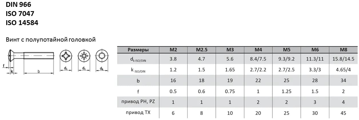 Винт DIN 966 имеет полупотайную головку под крестообразный шлиц, сочетая декоративность и надежность посадки. Аналоги стандарта: ISO 7047, ISO 14584, ГОСТ 17474-80, ГОСТ Р ИСО 7047-2013. При замене винтов необходимо сверять ключевые параметры (диаметр и шаг резьбы, длину стержня, геометрию головки), поскольку они могут незначительно отличаться.