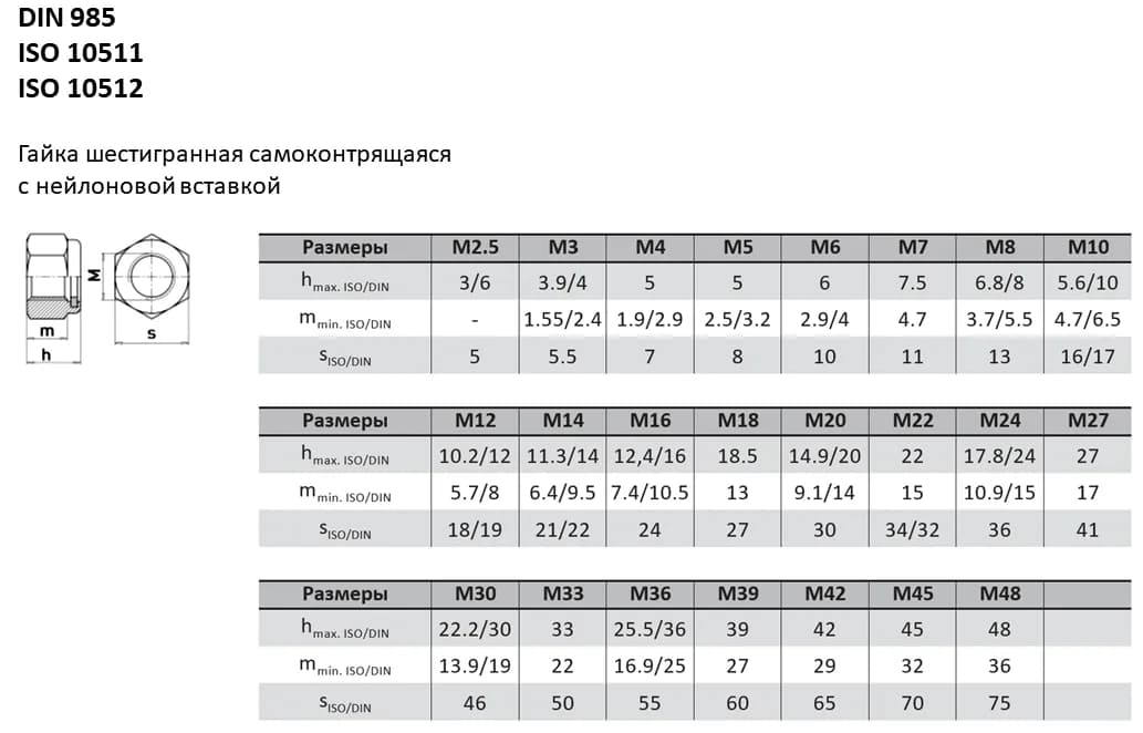 Самоконтрящаяся гайка DIN 985 оснащена нейлоновым (полиамидным) кольцом. При навинчивании кольцо деформируется по резьбе болта, создавая высокую силу трения и блокируя самопроизвольное раскручивание от вибрации. Аналоги стандарта: ISO 10511, ГОСТ ISO 10511-2016. При замене гаек между стандартами рекомендуется сверять ключевые параметры (диаметр и шаг резьбы, размер под ключ, внутренний диаметр отверстия), поскольку они могут незначительно отличаться.