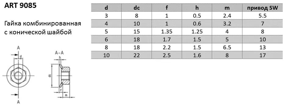 Гайка М5, ART 9085 комбинированная с конической шайбой, нержавеющая сталь А2
