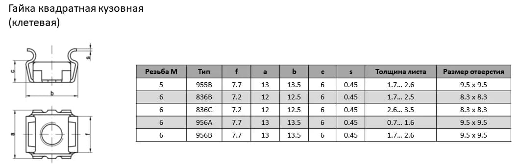 Гайка М6 956A квадратная кузовная для листа 0.7-1.6 мм, отверстие 9.5х9.5 мм, оцинкованная