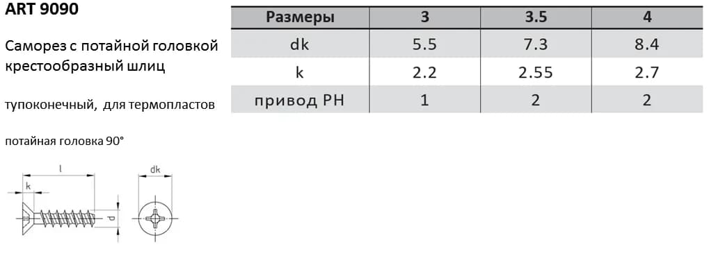 Саморез d3х8, ART 9090 с потайной головкой тупоконечный для пластика, нержавеющая сталь А2