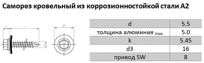Номинальный диаметр резьбы составляет 5.5 мм. Общая длина изделия — 65 мм. Сверлящая способность позволяет проходить сквозь пакет материалов толщиной до 5 мм. Нержавеющая сталь А2 обладает отличной стойкостью к атмосферной коррозии.