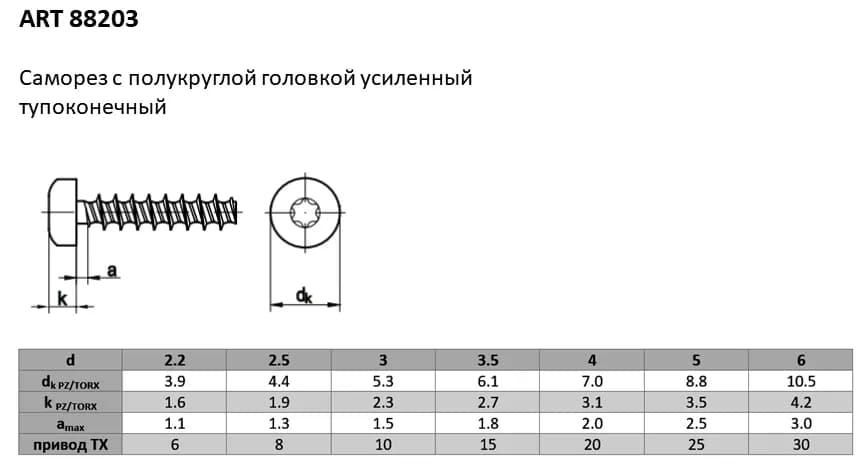 Полукруглая головка создает надежный прижим и имеет эстетичный скругленный профиль. Шлиц TORX (звездочка) гарантирует идеальную передачу момента и предотвращает износ инструмента. Тупоконечный наконечник используется в специальных соединениях для работы с дюбелями или предотвращения раскола тонких материалов.